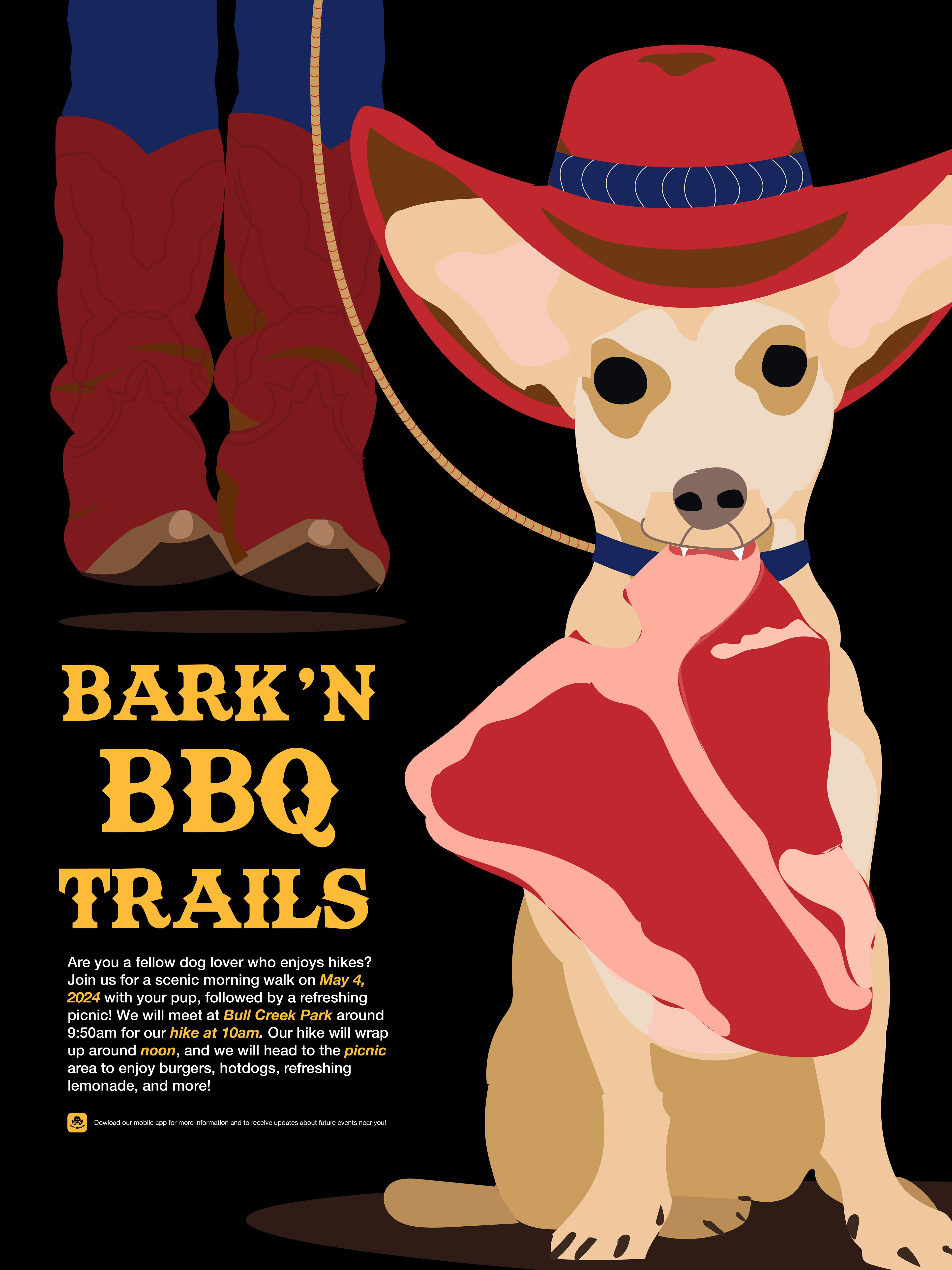I designed a set of cohesive brand elements for Bark’n BBQ Trails, a Texas-based company that brings dog owners together for hikes and picnics. Following brand guidelines and leaning into the company’s Texan roots, I created a bold, recognizable logo, a flexible event poster, and a companion app prototype. The poster was built for easy updates, allowing organizers to swap out event times and locations, while the app helps users find local trails, RSVP for walks, and join the community. Using a consistent color palette, typography, and visual style, I built a unified brand experience that feels warm, local, and community-driven, encouraging connection, exploration, and a shared love of the outdoors.