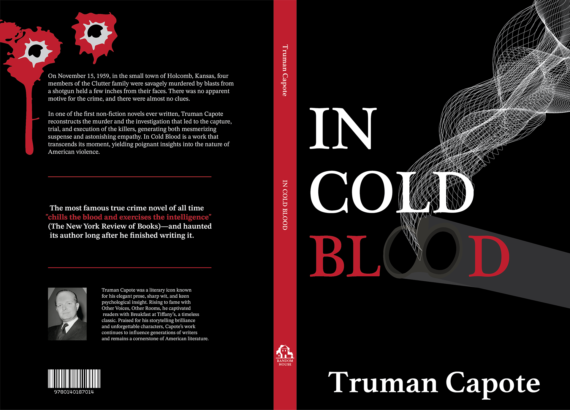 I redesigned People Who Don’t Know They’re Dead, In Cold Blood, and A Visit from the Goon Squad with a focus on modernizing their visuals and interpreting each story’s themes through imagery and form. For People Who Don’t Know They’re Dead, I turned the title into a gravestone, using bright, unexpected color to contrast its dark humor and paranormal tone. In Cold Blood is stripped to its violent core, dominated by a shotgun and stark contrast to evoke danger and unease. For A Visit from the Goon Squad, layered, disintegrating forms reflect how time fractures and connects lives throughout the novel. Across all three, bold color, strong composition, and symbolic detail work together to create striking, contemporary covers that both stand out and capture the essence of each story.