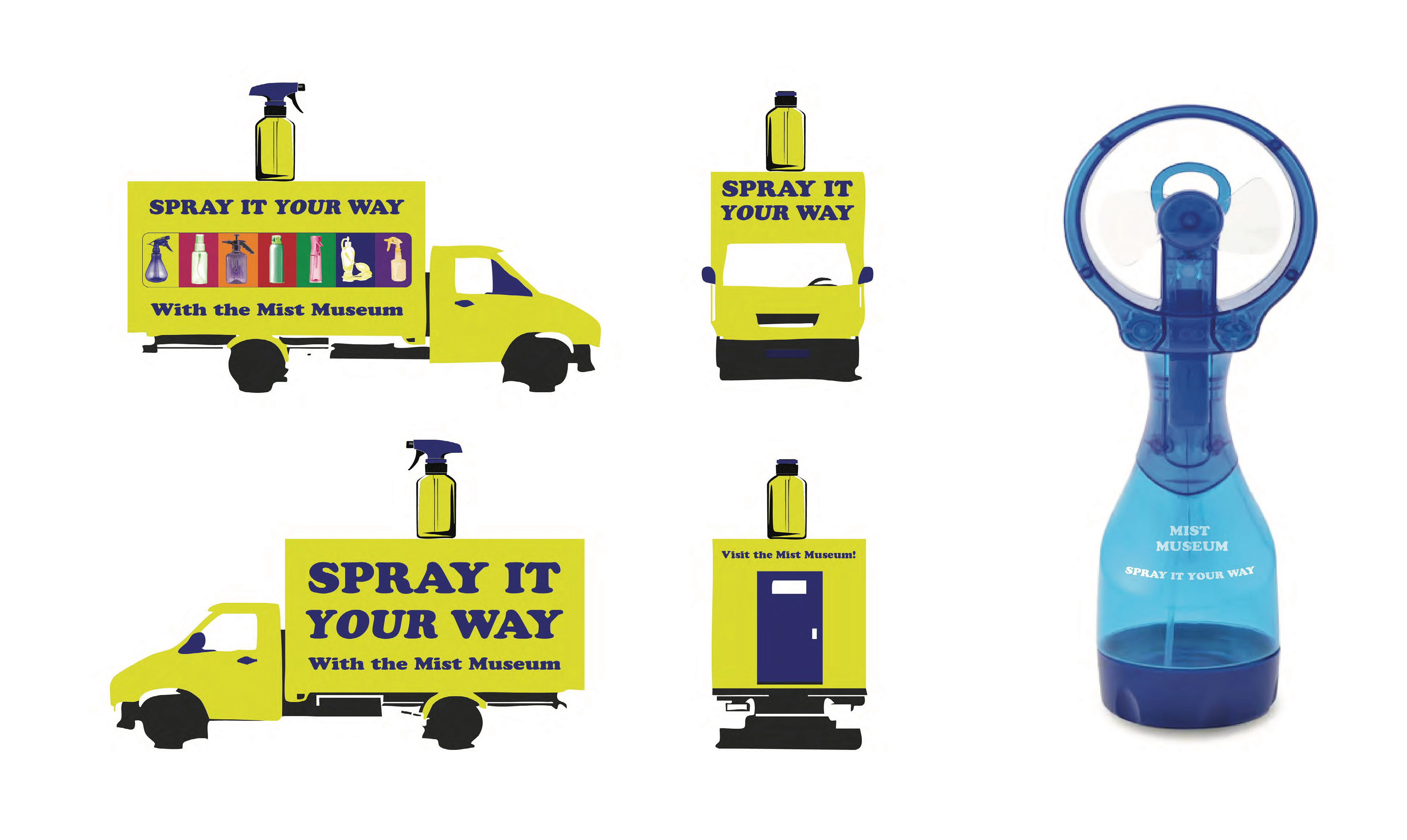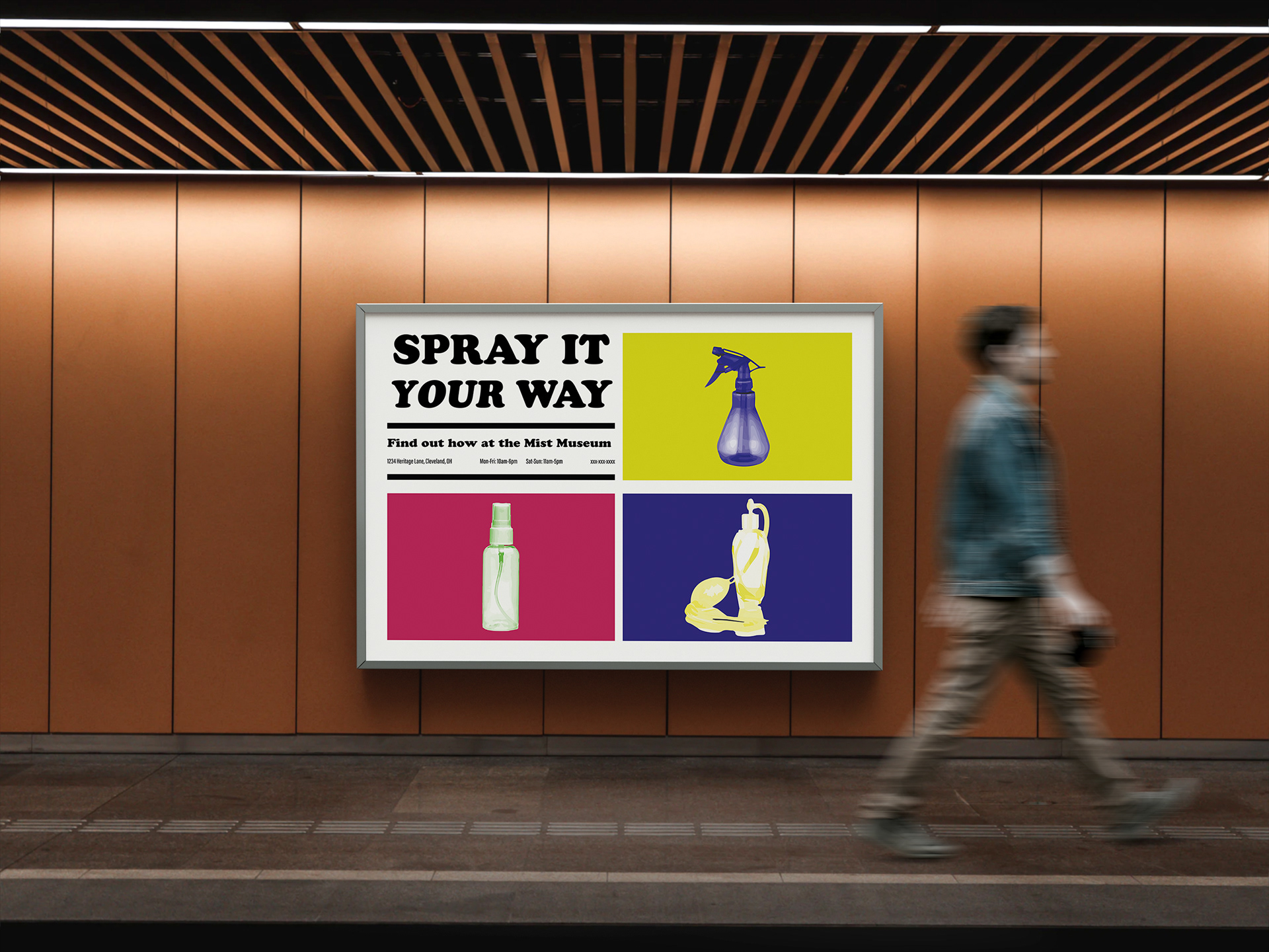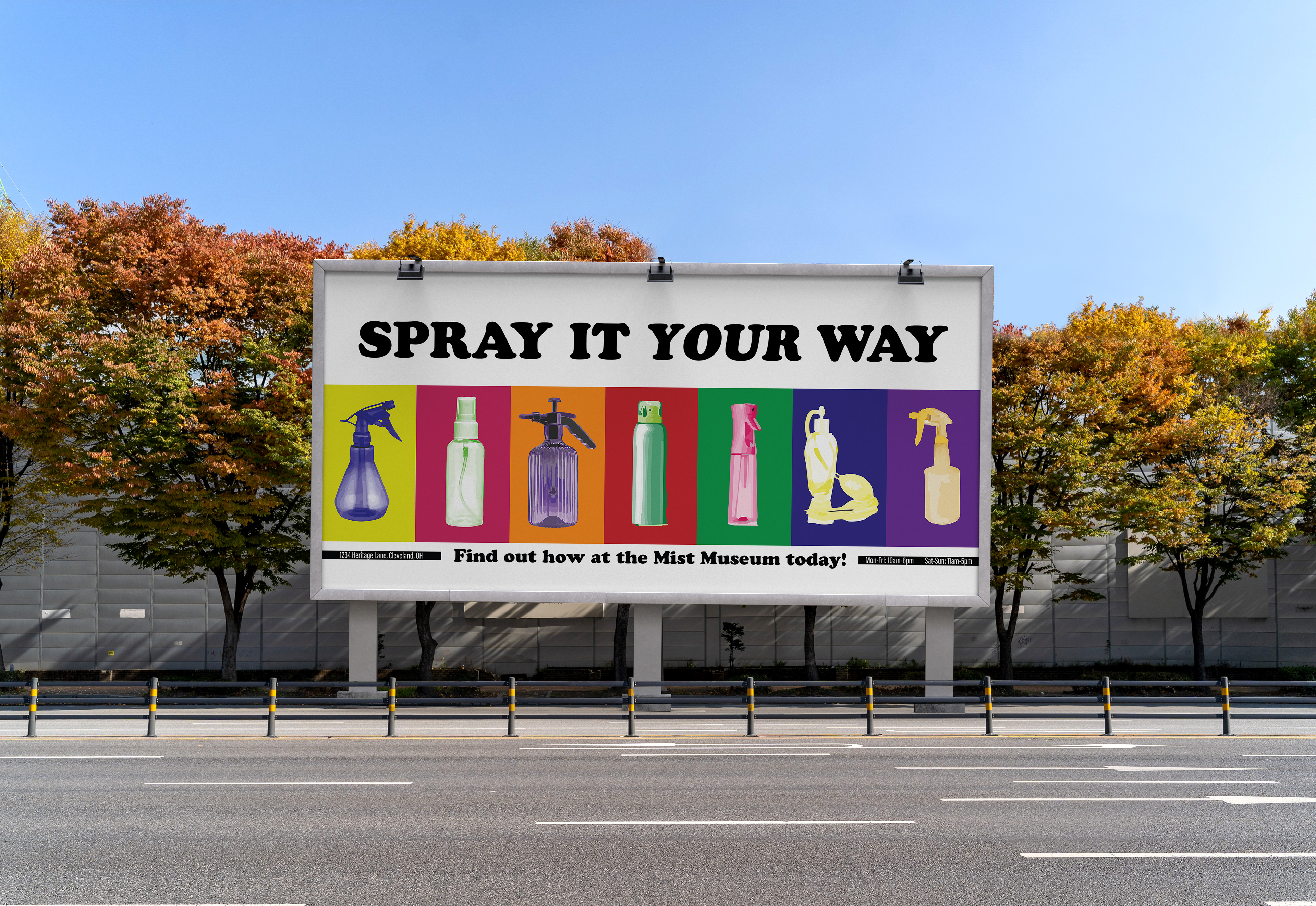 I developed a bold, pop-art–inspired campaign for the Mist Museum, guiding the project from concept ideation to final execution. The goal was to reimagine the everyday spray bottle as something vibrant and worth celebrating. Through playful color, strong form contrast, and the slogan “Spray It Your Way,” the campaign encourages people to see how spray bottles fit into their own lives. The visuals spanned billboards, motion ads, and a one-of-a-kind activation—a branded truck featuring a functional misting bottle that visited summer events to cool crowds and distribute branded souvenir sprays. Together, these elements create a cohesive, engaging campaign that connects art and everyday life in a personal and memorable way.